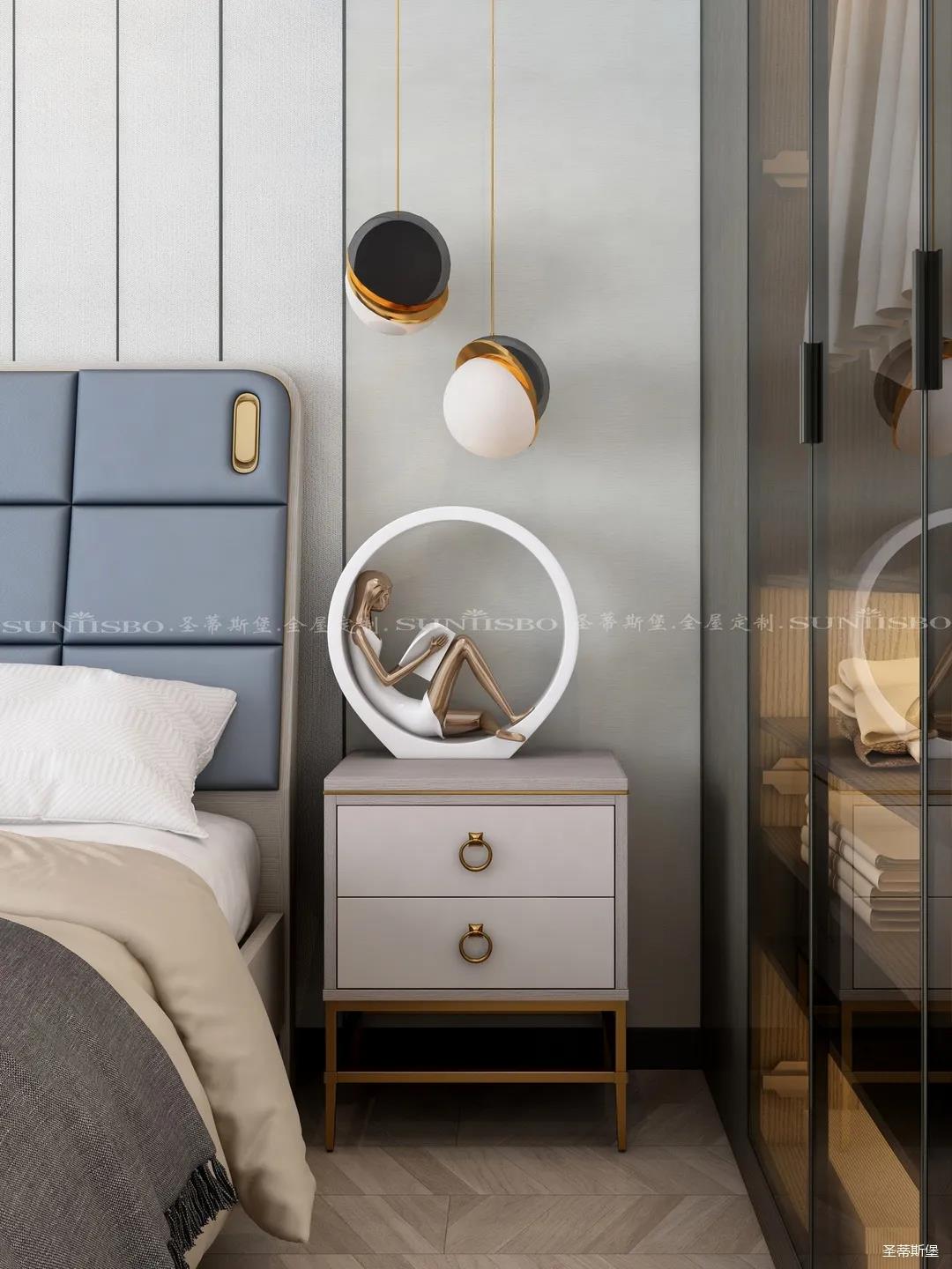 卧室的设计继续延续着空间的高级灰,蓝灰色彩的对比,让主卧空间层次感更加丰富,充足的阳光随意散落,空间更加温暖大气,对称的球形吊灯设计,恍如两个“快乐星球”,展现着空间应有的艺术性,设计师巧妙地设计,营造出与众不同的生活品质。